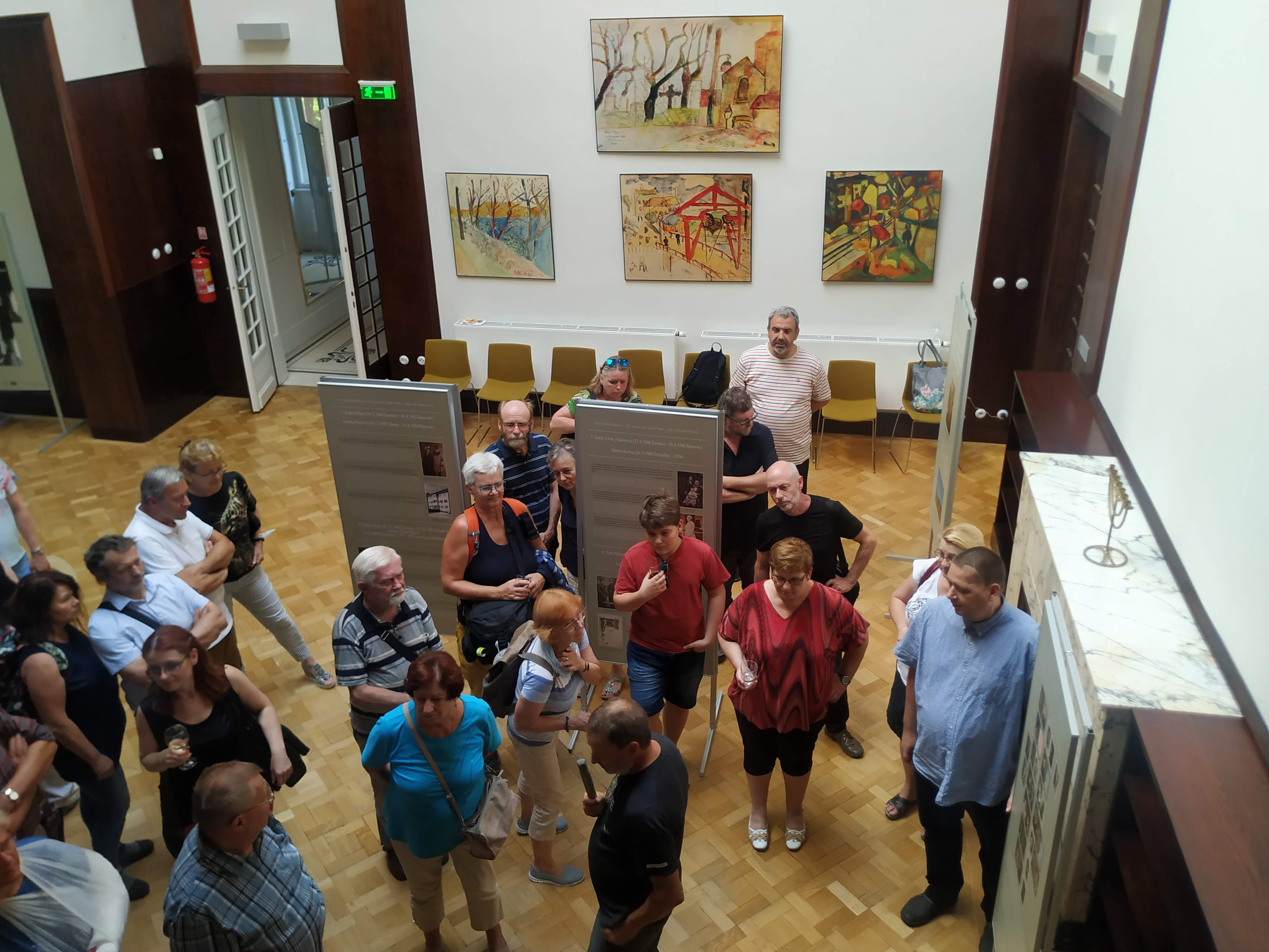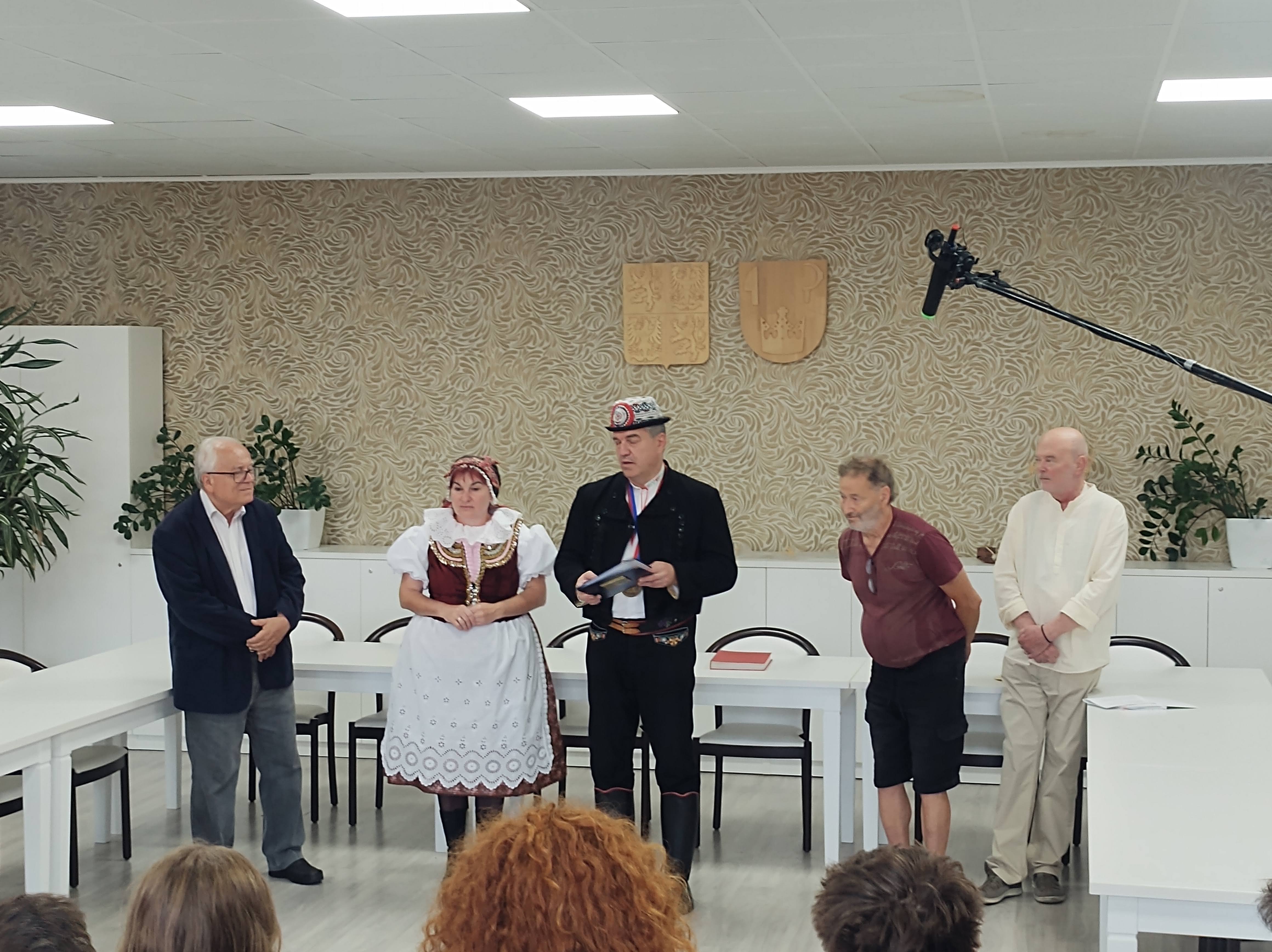 Přivítání účastníků Velblouda 2025 na radnici v Žarošicích: historik Friedl Garscha (DÖW), místostarostka obce Marcela Buchlovská, starosta Jiří Kacer, potomek rodiny Maierových Vilém Reinöhl, spoluorganizátor Velblouda Leoš Fučík.